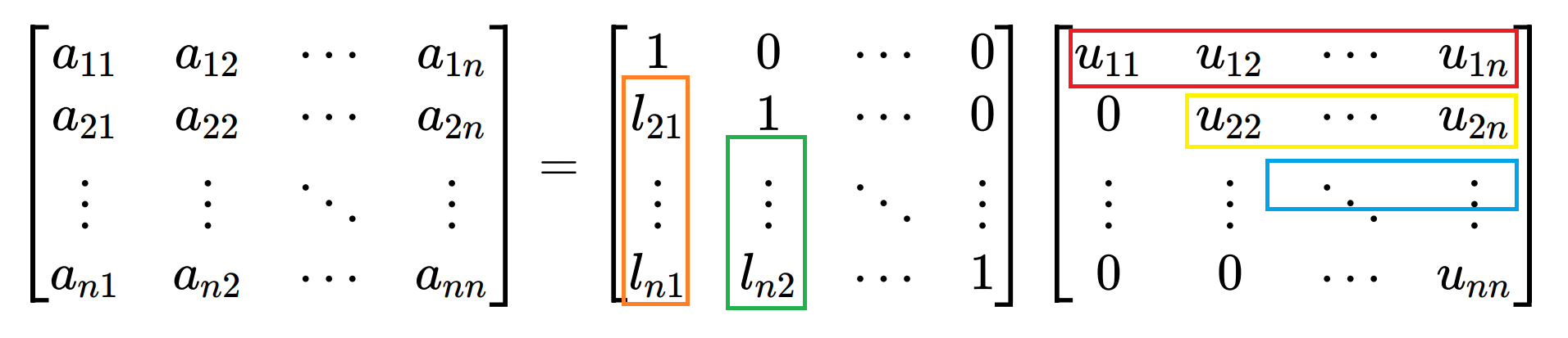 [ a 11 a 12 ⋯ a 1 n a 21 a 22 ⋯ a 2 n ⋮ ⋮ ⋱ ⋮ a n 1 a n 2 ⋯ a n n ] = [ 1 0 ⋯ 0 l 21 1 ⋯ 0 ⋮ ⋮ ⋱ ⋮ l n 1 l n 2 ⋯ 1 ] [ u 11 u 12 ⋯ u 1 n 0 u 22 ⋯ u 2 n ⋮ ⋮ ⋱ ⋮ 0 0 ⋯ u n n ] \begin{bmatrix}