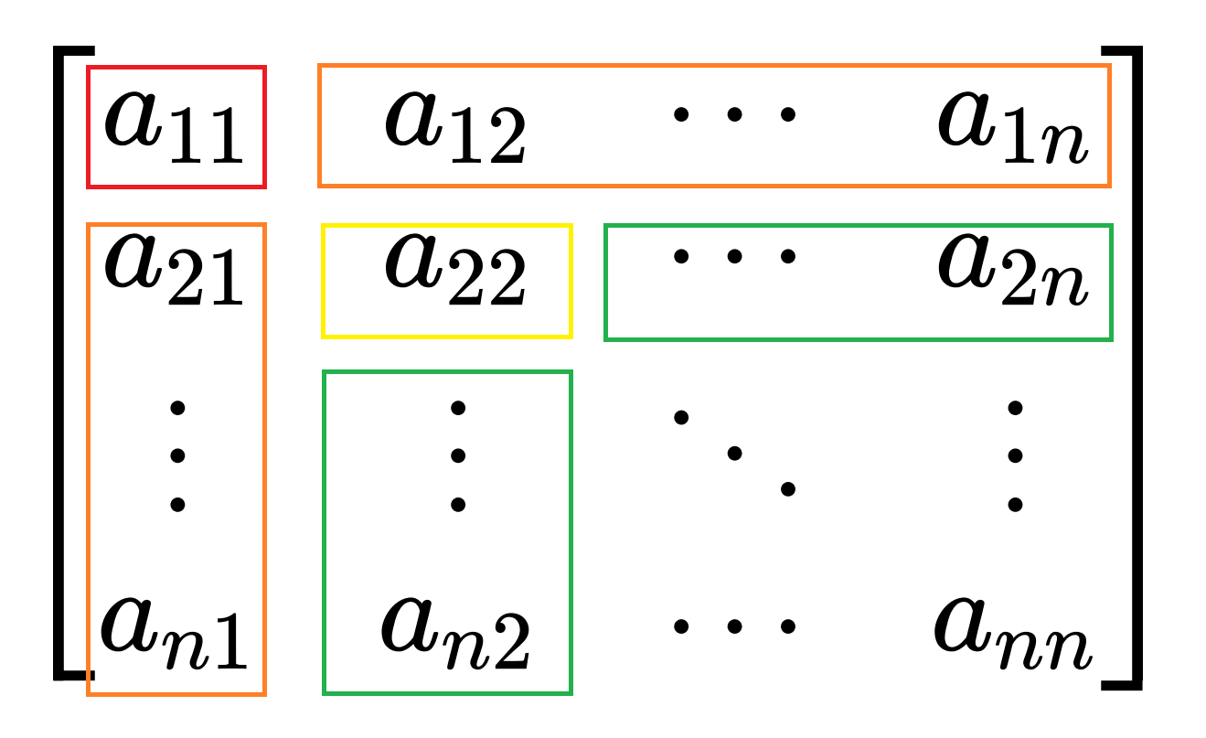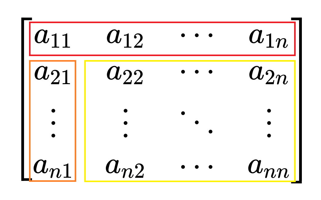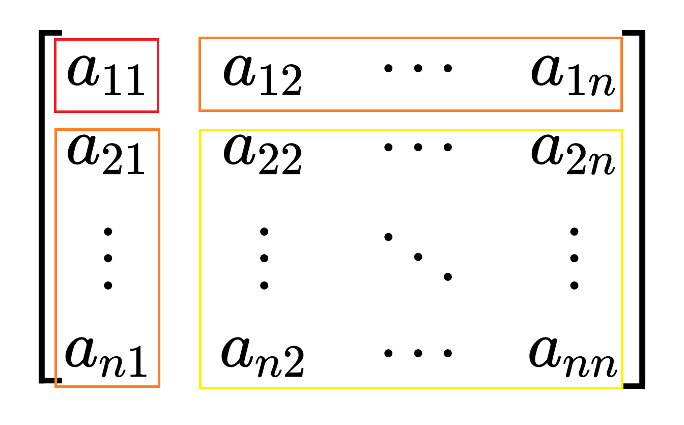 A = [ 1 0 l / a 11 L n − 1 ] [ a 11 0 0 D n − 1 ] [ 1 l T / a 11 0 L n − 1 T ] A = \begin{bmatrix}