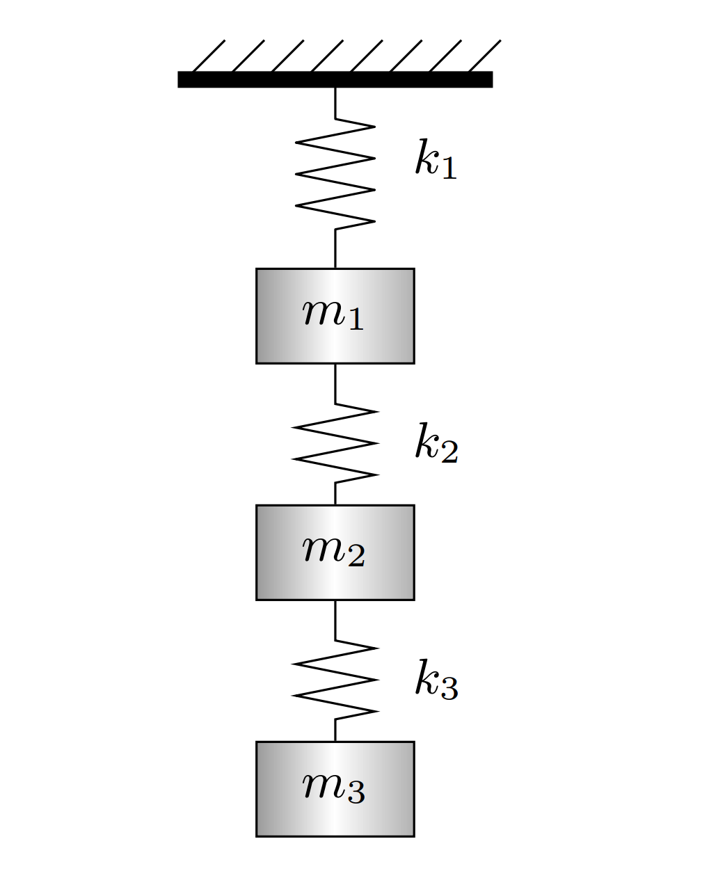 考虑弹簧-质点系统,质点 m j m_j m j 的竖向位移为 y j ( t ) y_j(t) y j ( t ) ,运动方程为: